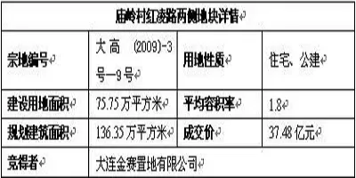 4月28日,大连金赛置地有限公司以37.48亿元总价拿下大连高新区庙岭村红凌路两侧7宗地块,成为2008年市场调整以来的首个总价“地王”。