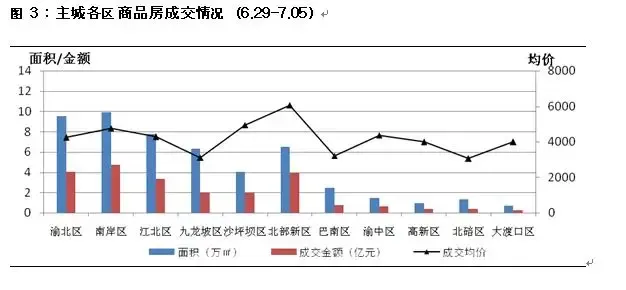 上周,渝北区商品房共成交1097套,占据榜首,南岸区和江北区分别以成交1067套和876套位居第二、第三位。成交量最小的区域是北碚区和大渡口区,成交套数分别是133套和94套。