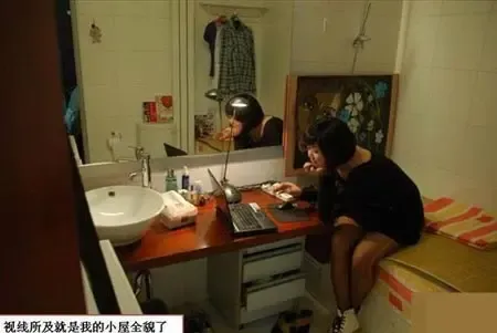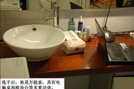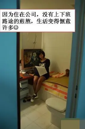 “hegnghb”在帖子中还发了几张那位美女在家的照片。那位美女附图说:“这就是我们公司的杂物间兼卫生间了(现在是我的家),soho的户型设计还不错,这间杂物室有7平方米左右,小屋里还有洗手台和卫生设施。估计设计之初,也是准备作为一个休息室的吧。虽说没有窗户,关上门一团漆黑,但是四面有整洁的白瓷砖,以及一面大更衣镜。最重要的是价格便宜(公司免费提供)。”