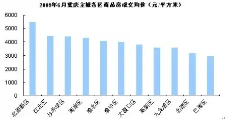 2009年6月,从区域商品房成交均价来看,北部新区成交均价5519元/平方米,依旧位居各区之首,高出排行第二江北区近1000元/平方米;其次是江北区、沙坪坝区、南岸区、渝北区、渝中区商品房成交均价集中在4000-4500元/平方米之间;大渡口区、高新区、九龙坡区商品房成交均价集中在3600-4000元/平方米之间;北碚区商品房成交均价超过了3000元/平方米,为3173元/平方米;巴南区成交均价最低,为2939元/平方米。
