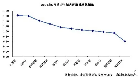从2008年1月-2009年6月区域累计供销比来看,北碚区、巴南区供过于求特征明显,分别为1.62和1.60;其次是沙坪坝区,为1.41;九龙坡区、南岸区、渝北区、高新区、江北区供销比差异不大,供销基本平衡,集中在1-1.3之间;渝中区、北部新区和大渡口区供销比分别为0.97、0.94和0.62,处于供不应求状态。