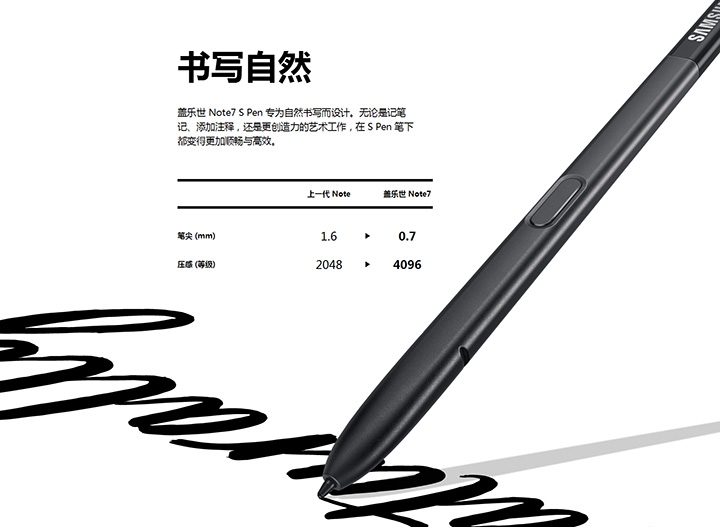 三星Galaxy Note7上搭载的S Pen在硬件方面再一次升级,首先是笔尖只有0.7毫米,压力感应等级提升至4096级压感,实际体验的手写感受会更加顺畅高效贴近真实。