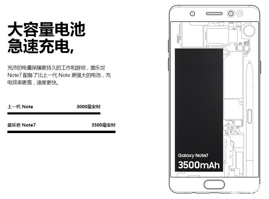 得益于骁龙820处理器的特性,以及Type-C接口的支持,Note7终于支持了QC3.0快速充电技术。电池容量方面,Note7也从此前的3000毫安时以下提升了500毫安时,达到了3500毫安时,但依旧比S7 edge的3600毫安时要稍小一些,理论续航会差一些。实际体验来看二者差距并不大,加上充电效率的提升,相信Note7能够在续航方面带来不错的体验。