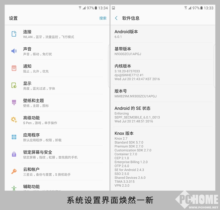 操作系统方面,Note7依然是搭载了基于安卓6.0的系统,不过新一代的Touch Wiz在细节方面有了不少改进与提升。比如抢红包、应用多开、黄页这些本土化的功能等。变化最大的应该就是设置以及通知栏的界面风格,接下来就通过截图来给大家展示一下。