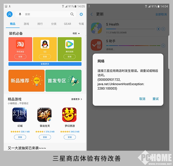 用户使用手机归根到底还是在用软件,国行版三星手机自带的应用商店一直都是已达痛点,到了Note7依旧没有太大改善。即便是与国内知名的应用助手平台进行合作,但实际体验依然很一般,下载缓慢、中途断线、应用更新慢等等问题照旧,真的希望三星能够在这方面多加快点脚步。