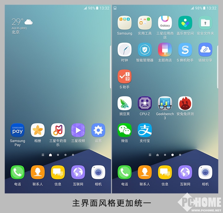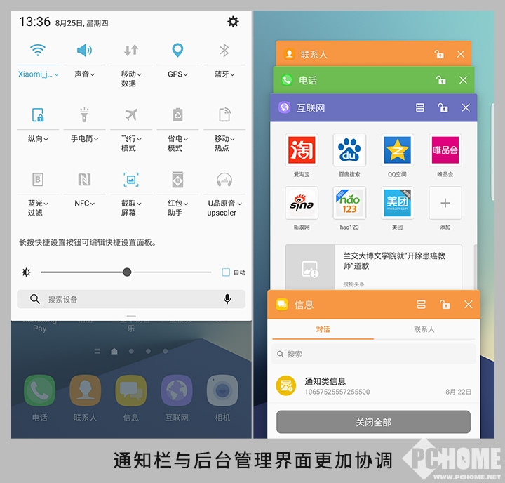 配色与图标更加统一,原先第三方图标个别情况下是没有适配的,而到了Note7上则全面加上了外观设计。整体风格更加统一,看上去也更加舒服。