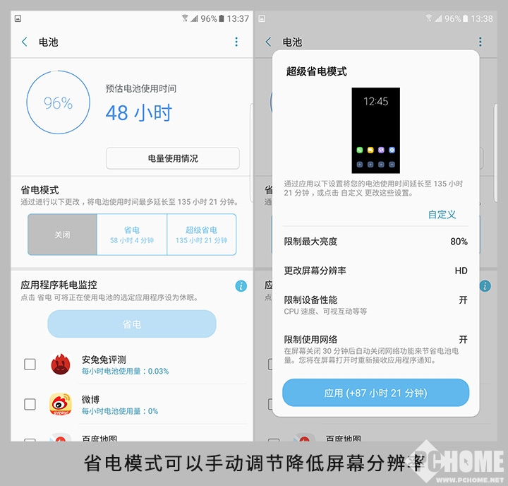 在智能管家中Note7还对省电管理进行了深度改造,Note7的节电模式分为三个级别,关闭、中度和极限。实测电量96%下,关闭可坚持48小时,中等可坚持58小时4分,而在极限下,可达135小时21分。这样一个数据很显然并不真实,但也说明不同等级对于系统功耗的管控是更加全面深层。意思的是,Note7的省电模式还可以更改屏幕分辨率,有点类似华为手机上ROG模式,同样可以实现1080P或者720P的显示模式。降低分辨率功能在省电之余还有另外一个好处就是自动放大屏幕元素,类似全局“老人模式”,这对于视力较差的用户来说可能是意外之喜。