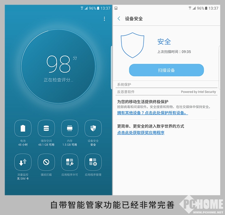 智能管理器也进行了全新升级,整体的UI设计更为扁平、直观,而且加入了评分功能。除了常见的管理功能,包括应用权限管理、拦截骚扰、流量控制等一应俱全,完全不需要在安卓第三方管家软件。