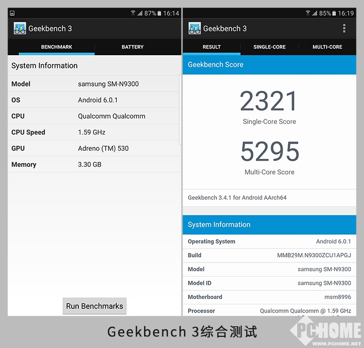 综合测试中,Note7单核测试得分是2321分,多核得分是5295分,性能异常强大,单线程与多线程能力均达到了目前旗舰手机的极值。