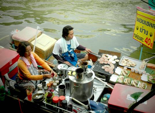 如果要在曼谷找到一个几乎没有游客去的水上市场,那一定就是Khong Lat Mayom了,距离市中心只有20公里的距离,保留了原汁原味的当地特色,深受当地人的喜爱,其他市场中小商品是小贩们主要售卖的商品,但是在这里,美食才是主题,游客坐在岸上的小木凳上,点上一份泰式炒粉,而商家则坐在船上进行烹饪,在河边吹着风吃着美食,舒服极啦!