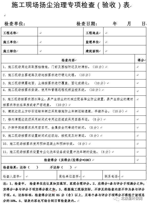7.施工现场扬尘治理检查标准统一参照《施工现场扬尘治理专项检查(验收)表》(见附件),检查得分达到85分(含)以上,且每个参与评分子项得分不得低于该项总分的50%即为达标,低于上述标准为不达标。
