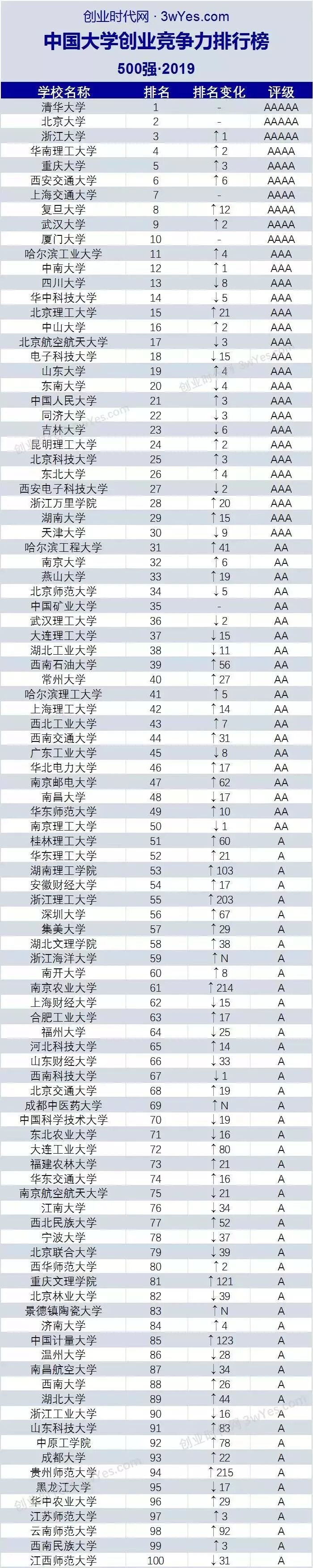 “中国大学创业竞争力排行榜500强·2019”榜单,将大学创业竞争力解构为创业教育、创业活动、创业潜力、创业人才四大维度,具体选取了创业课程开设数量、申请专利数量、专利获奖数量、挑战杯创业大赛获奖数量、国家级创新创业训练项目数量、国家级大学科技园、创业毕业生数量、上市公司企业家数量、福布斯富豪榜企业家数量9个细分指标对中国大学的创业竞争力进行量化并完成排名。