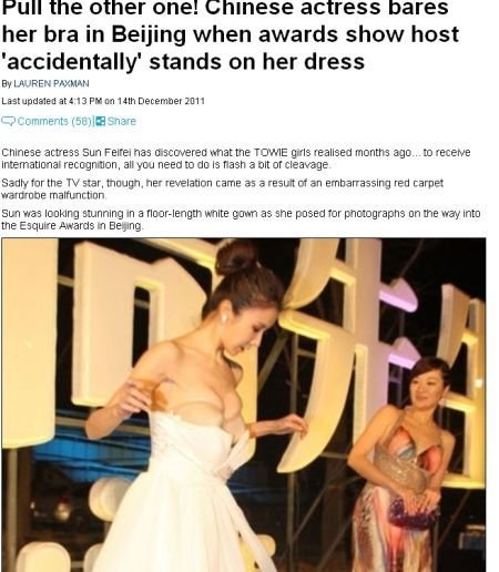 每日邮报》报道称女星要想在红毯上获得国际关注,一种普遍的共识是撕开裙角,秀出乳沟,而孙菲菲遭遇的意外也充分证实了这一点。