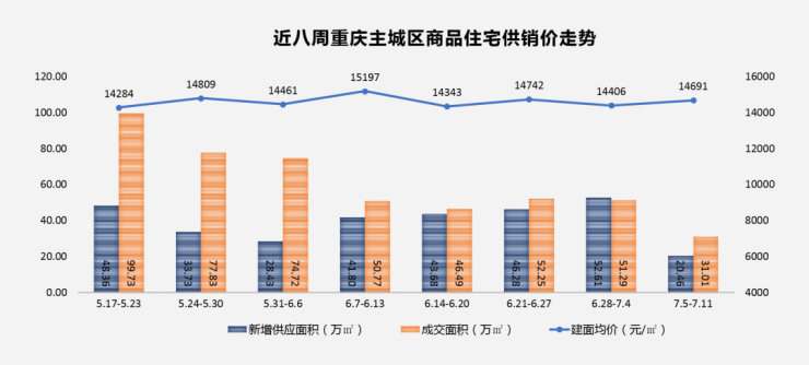 最近,重庆楼市热度正在逐渐回缓。数据显示,7.5-7.11重庆主城区商品住宅的供应量和成交量双双下滑。这对购房者而言算是好事:市场短期涨价动力变弱了。这种情况下,购房者相对来说可以拥有更多时间挑选心仪的房产,也更容易买到理想的居所。