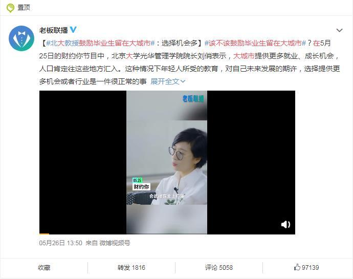 在5月25日的财约你节目中,北京大学光华管理学院院长刘俏表示,大城市提供更多就业、成长机会,人口肯定往这些地方汇入。这种情况下年轻人所受的教育,对自己未来发展的期许,选择提供更多机会或者行业是一件很正常的事。