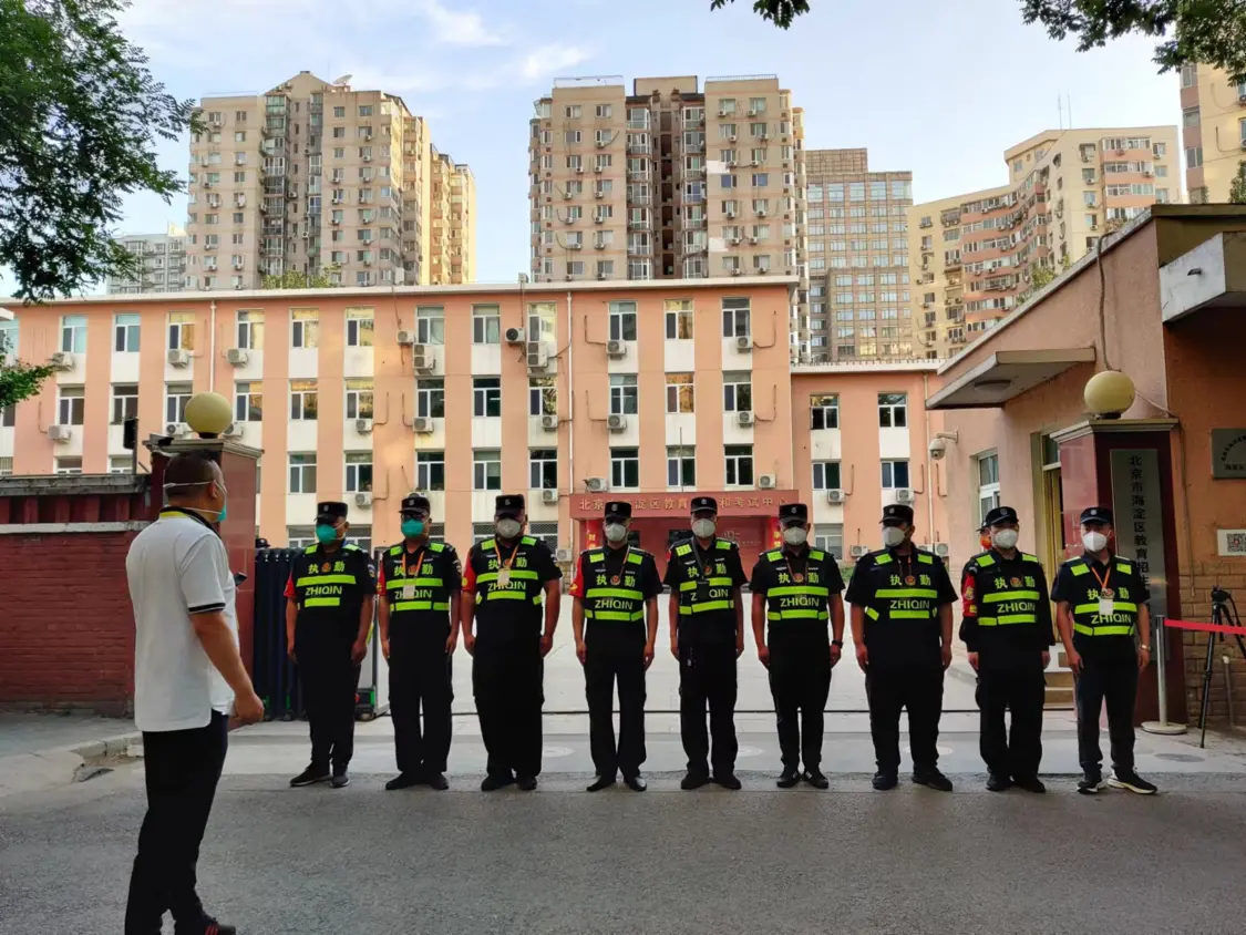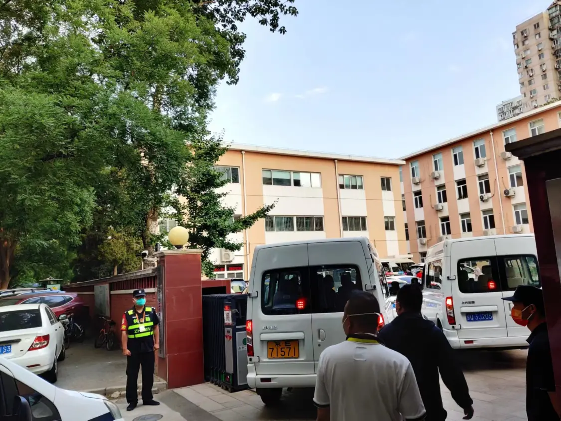 5点半前,执勤人员在北京市海淀区教育招生和考试中心门口集合。约5:40,第一辆运送高考试卷的车辆驶入该考试中心院内。在高考试卷被搬上车之后,6点之前第一辆高考试卷运送车驶离考试中心。