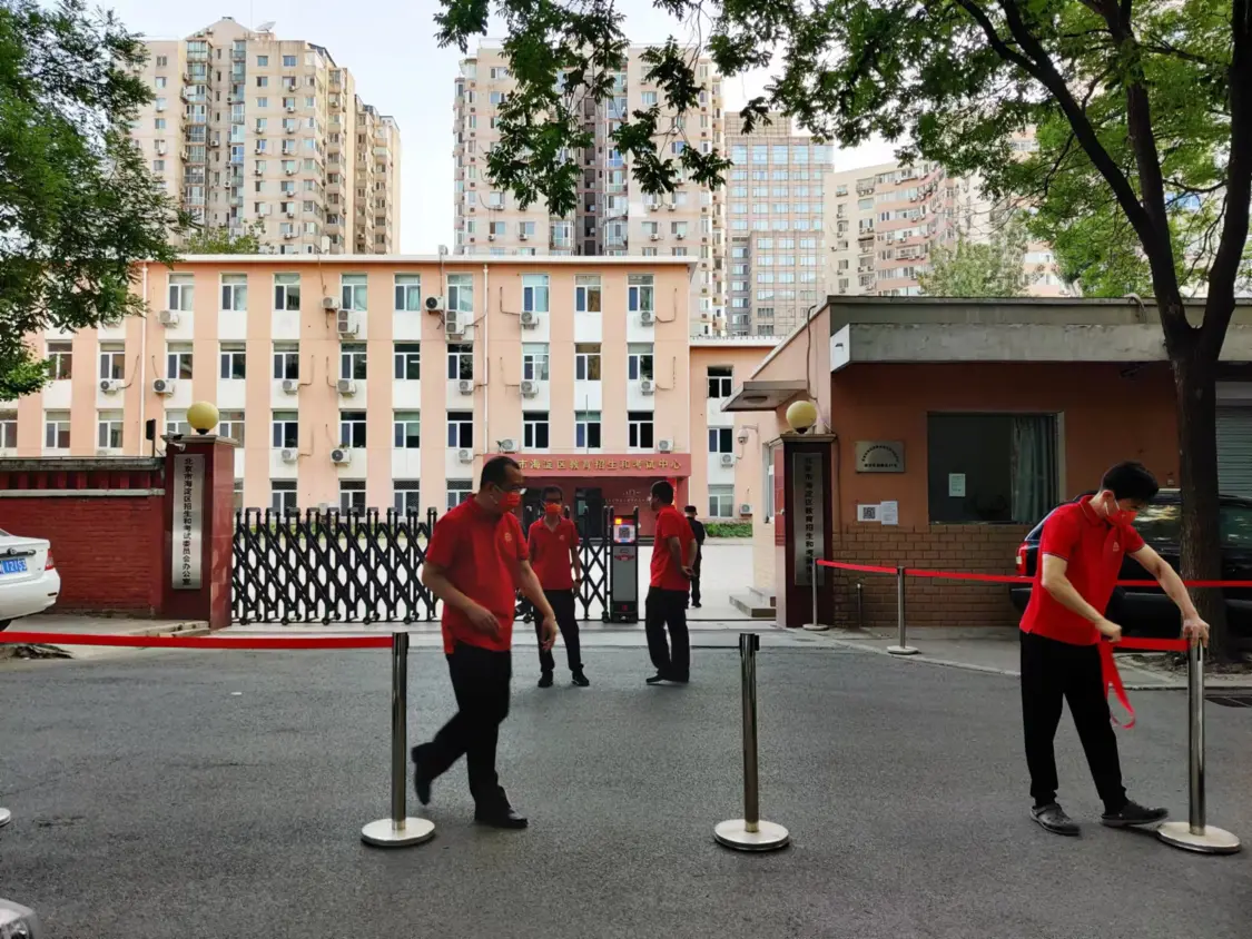 早上5:24,北京市海淀区教育招生和考试中心院外,工作人员拉起可伸缩活动围栏。本文图片均为澎湃新闻记者程婷摄