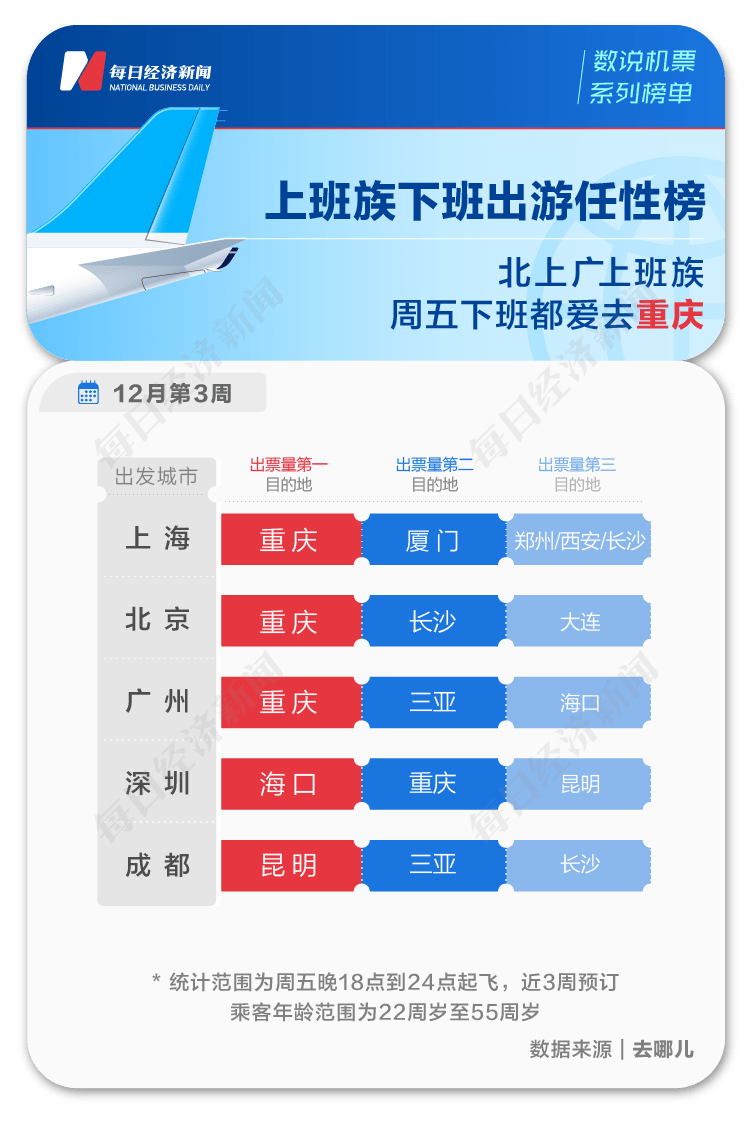 周五下班后,重庆成为一线城市上班族首选目的地。数据显示,在北京、上海、广州三地旅客的预订机票中,重庆均是出票量最多的目的地。在深圳旅客的出票量排序中,重庆也排在第二。与四座一线城市不同,cd旅客下班后常去昆明、三亚和长沙。