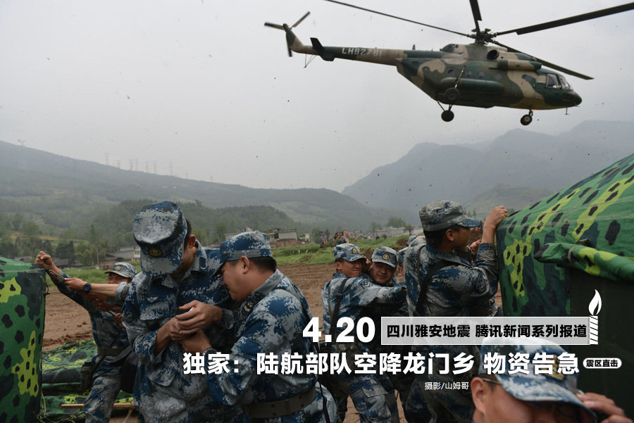 芦山县龙门乡古城村。4月21日,陆航部队出动直升飞机航道路尚不通的宝盛、太平重灾区。空军战士在着陆场保护刚搭建的帐篷。(摄影/山姆哥)