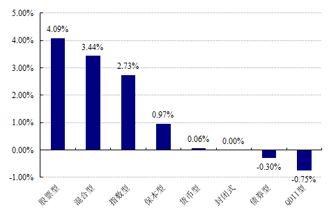 上周,国内外各类型基金均上涨,股票型、混合型和指数型基金表现居前,涨幅分别为4.09%、3.44%和2.73%,货币型、封闭式和债券型基金表现相对居后,涨幅分别为0.06%、0.00%和-0.30%,QDII型基金下跌,跌幅为0.75%。理财新闻中心