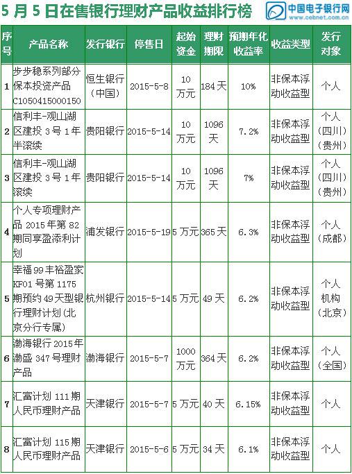 2015年5月5日在售银行理财理财动态产品收益排行榜