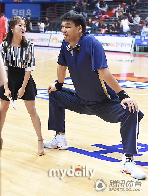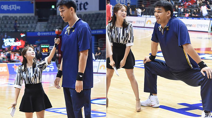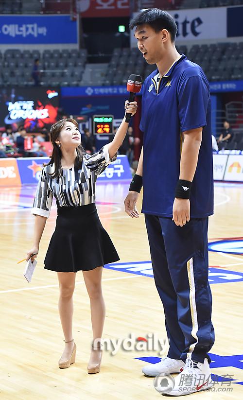 221cm韩国篮球队员河升镇蹲下配合女主持人采访。 (来自:腾讯体育)