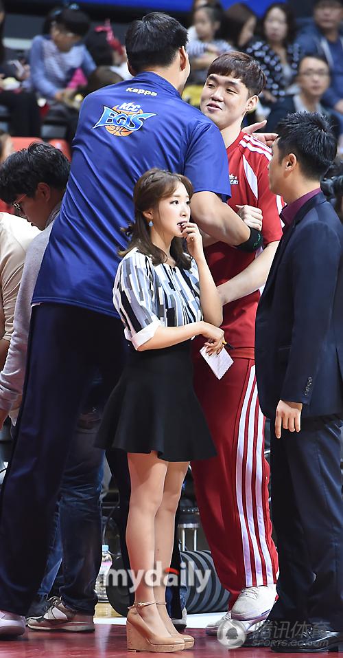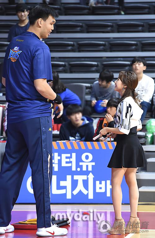 近日,16-17赛季的韩国职业篮球比赛KCC正式开赛,现场身高只有156cm的女主持人尴尬采访221cm韩国篮球队员河升镇,画面很有喜感。 (来自:腾讯体育)