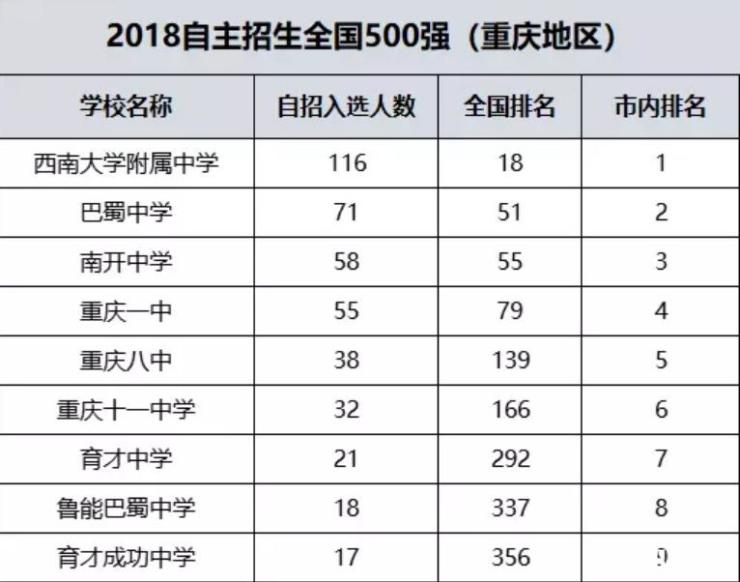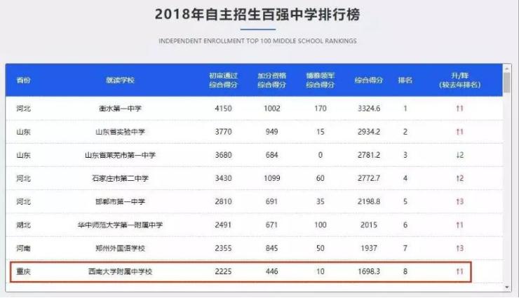 在“高校自主招生”这条路上,西大附中更是走在重庆原直属校的前端。2017年高考重本率90%以上,自招成绩全国第九,蝉联重庆第一;2018年自招成绩全国第八位,是重庆唯一进入全国十强的学校。(数据来源重庆升学信息发布https://baijiahao.baidu.com/s?id ... r=spider&for=pc