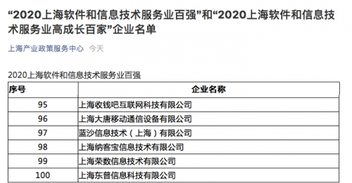 [港台娱乐圈] 收钱吧荣膺“2020年上海软件和信息技术服务业百强”称号