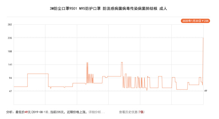某N95口罩的历史价格曲线,从最低价49元暴涨到235元,涨幅令人咂舌