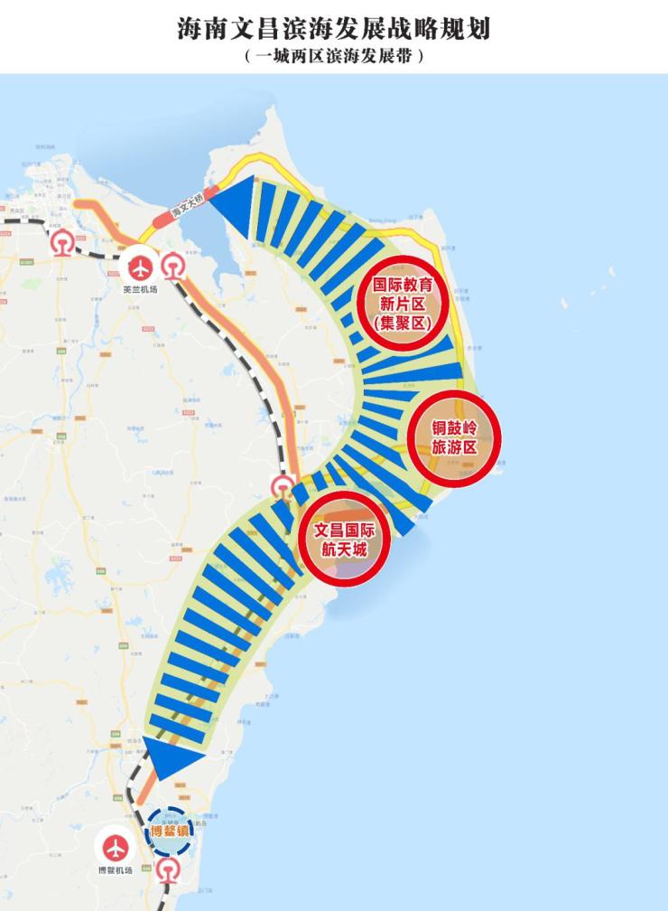 聚焦文昌北部“滨海发展带”,全面打造国际教育新片区(集聚区),形成与文昌国际航天城、铜鼓岭国际旅游区相互依托、相辅相成、相得益彰的“一城两区”滨海发展格局,并以此带动高端新型旅游康养服务于一体经济带的快速发展,从而打造海南自贸港建设中的新高地、新优势、新动能。