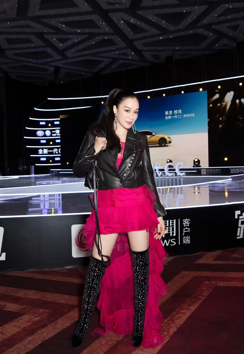 玫红色的连衣裙和黑色皮衣能够彰显不同风格,帅气的皮衣和性感的裙装结合起来,呈现出了可盐可甜的即视感,而且钟丽缇这条半身裙剪裁很特殊,前短后长可以拉长她的腿长,搭配长筒靴修饰了小腿,特别的时尚,如果是腿粗的话还驾驭不了。