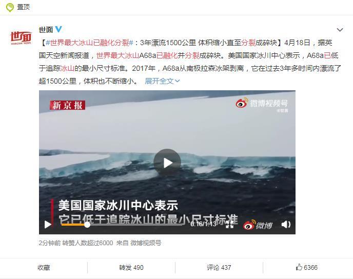 4月18日,据英国天空新闻报道,世界最大冰山A68a已融化并分裂成碎块。美国国家冰川中心表示,A68a已低于追踪冰山的最小尺寸标准。2017年,A68a从南极拉森冰架剥离,它在过去3年多时间内漂流了超1500公里,体积也不断缩小。
