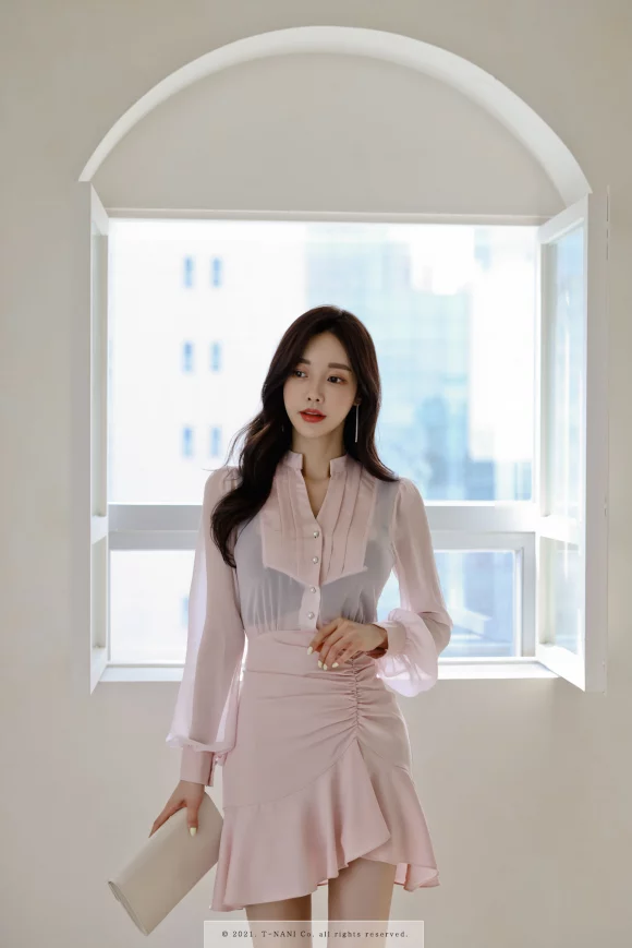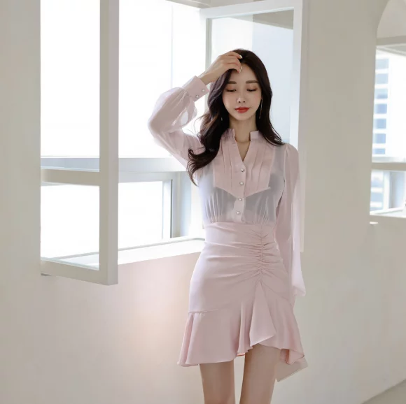 孙允珠气场全开,一身粉色透气雪纺包臀裙,长发飘飘好有气质