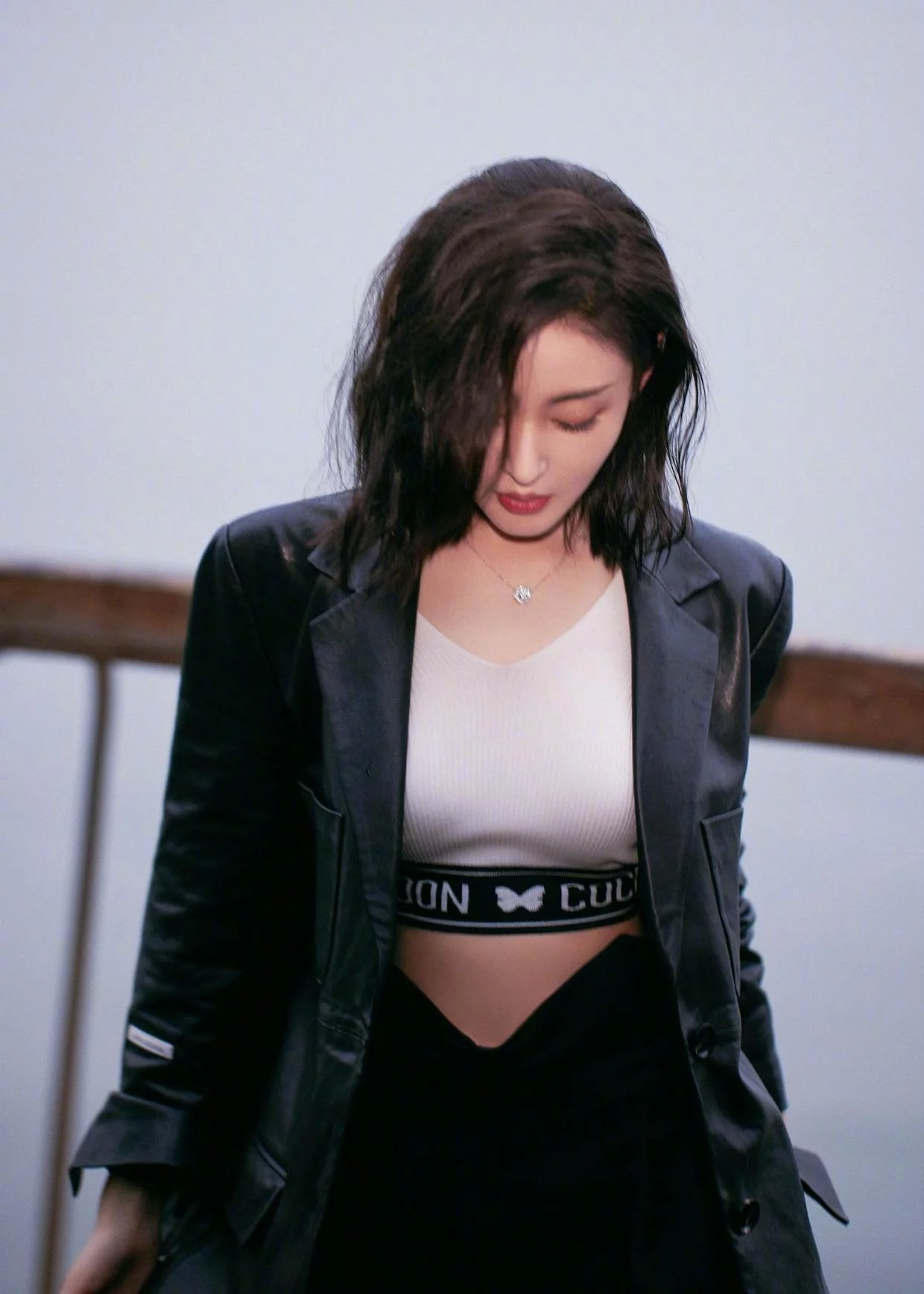 [八卦星闻] 张天爱的饱满身材比例真迷人,黑色皮衣搭配短裤拍大片,又酷又美