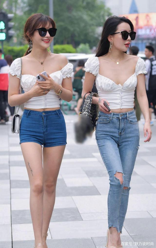 谈起闺蜜,很多女生都会有的吧?由于女生之间有些小秘密,也只有闺蜜说才比较方便,而且闺蜜之间一般都算兴趣相投,就算不投,那至少彼此之间是认同的。和闺蜜穿同样的衣服也是很常见的行为,比如,今天我要介绍的一对闺蜜,她两个人的上衣都是一样的,还有一点就是她们的颜值也都很好,不过对比之下,到底谁更好呢?在这儿我先买个关子,然后大家一起来看看下面,相信大家看了以后,会有答案的。由于穿的是同一件上衣,所以裤子的差异就显得更加明显,现在的夏天,很多女生都会穿紧身牛仔短裤,其实,只要是紧身牛仔裤,无论是长的还是短的,都很迷人。先看看左边的小妹妹,她穿着紧身牛仔裤短裤,裤子在两侧膝盖处打了个洞,这样既能增加时尚度,又能使人走路更方便,因为如果没有洞的话,穿着紧身牛仔裤蹲起来会很不舒服,整个人都像被裤子拉住一样,被提起时会感觉很不舒服。一般而言,夏天穿长裤还是比较少的,但是紧身牛仔裤绝对是个意外,因为它真的太能展现女人的魅力了,而且也是非常百搭的单品,我想,无论上衣是什么样的款式,穿上紧身牛仔裤,基本上都能配得很好,即使不十分惊艳,那一般也不会太难看。