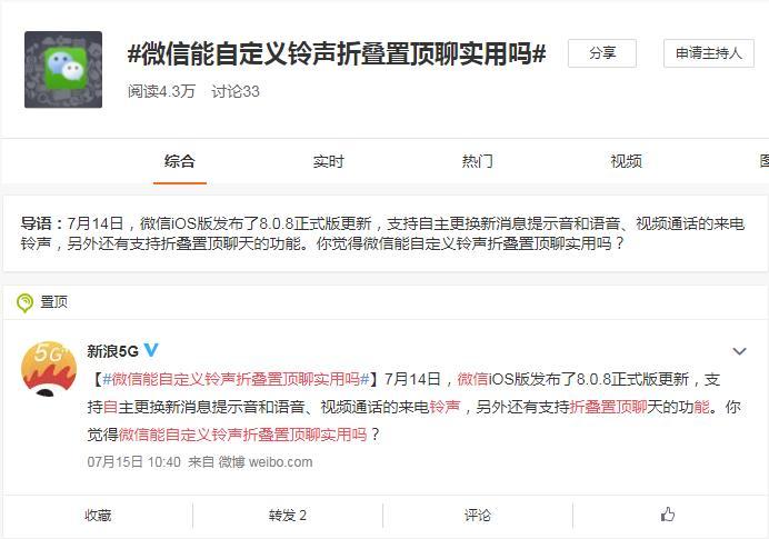 7月14日,微信iOS版发布了8.0.8正式版更新,支持自主更换新消息提示音和语音、视频通话的来电铃声,另外还有支持折叠置顶聊天的功能。众多用户梦寐以求的彰显个性的机会终于来了。