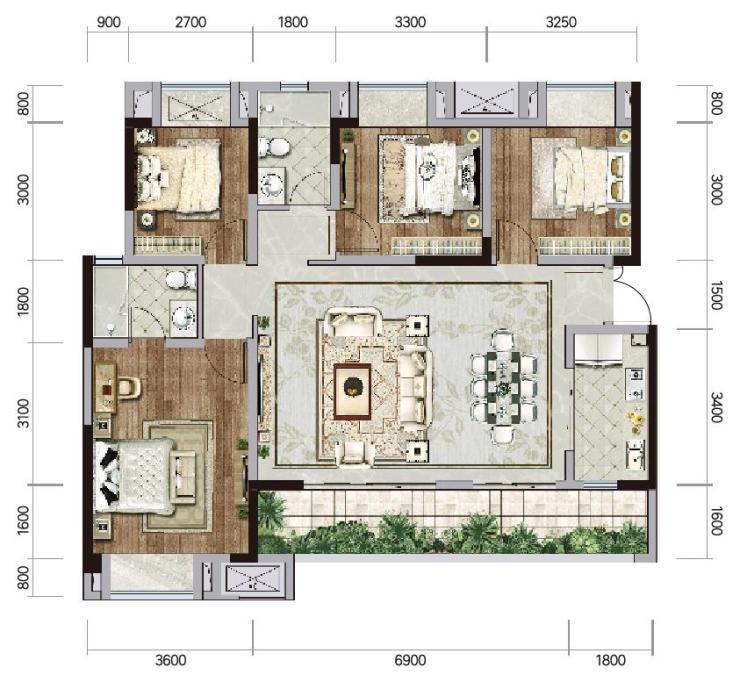 三代同乐之需 方正四室分区设立,室室飘窗有近有距,让三代同堂与各享天地尽皆满足。此外,约7.7米阔尺景观大阳台,拓展居家时光,让天真童趣与莳花养生可以尽情发生。