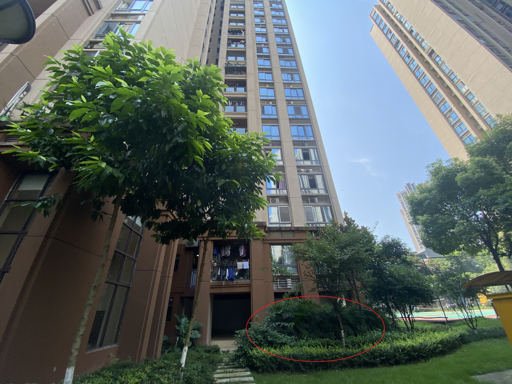 2020年11月2日,2名幼童从重庆南岸区锦江华府4栋15楼坠下(红圈处),检方指控孩子父亲涉嫌故意杀人。 澎湃新闻记者 谢寅宗 图