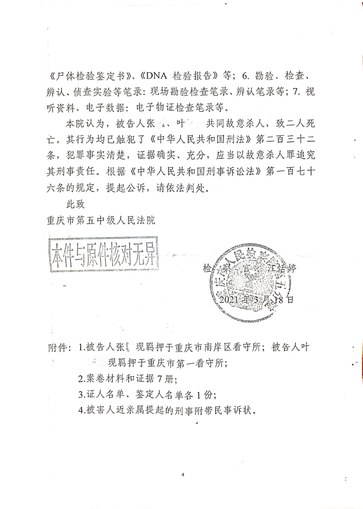 jf侦查终结移送审查起诉后,重庆市五分检今年3月18日以张某、叶某尘共同故意杀人,致二人死亡,应当以故意杀人罪追究刑事责任向重庆市五中院提起公诉。