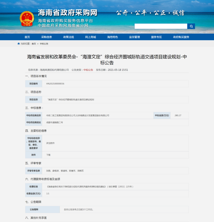 注:“海澄文定”综合经济圈城际轨交项目中标公告(图源于海南省****采购网)