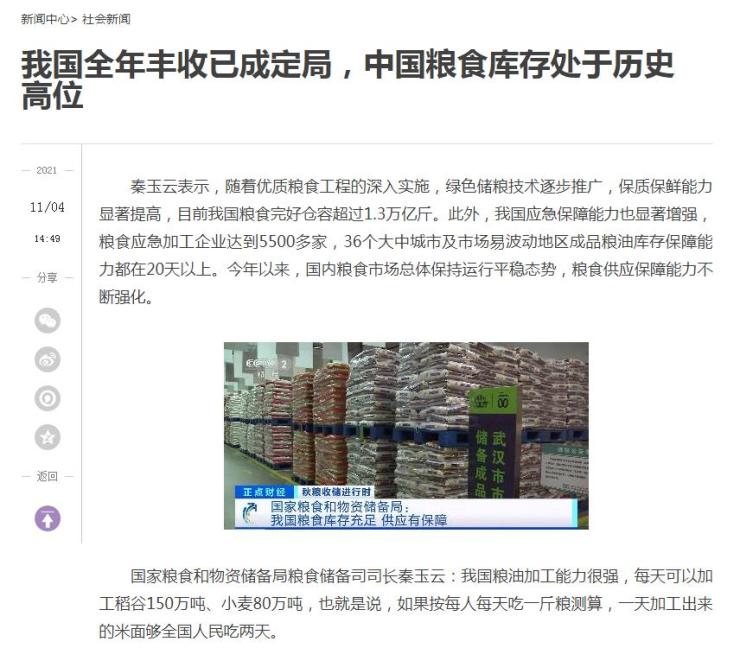 国家粮食和物资储备局相关负责人11月3日表示,我国秋粮收获接近尾声,全年丰收已成定局,产量将连续7年保持在1.3万亿斤以上,当前库存总量充足,处于历史高位,国内粮食市场供应完全有保障。