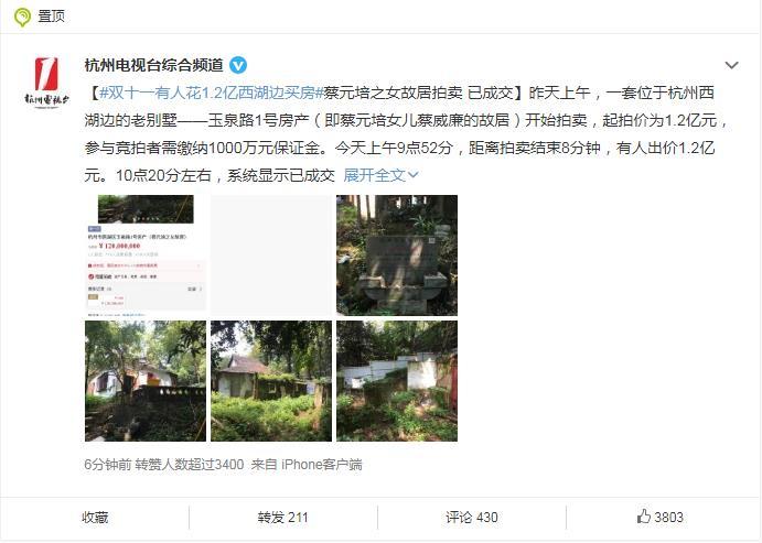 双11当日,一套位于杭州西湖边的老别墅——玉泉路1号房产(即蔡元培女儿蔡威廉的故居)顺利成交,成交价1.2亿元。值得注意的是,这套房子并非司法拍卖,而是资产处置,也就是普通的二手房拍卖。