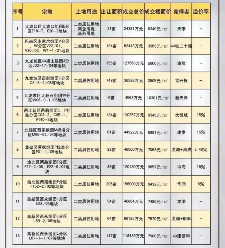 本次土拍无流拍,其实可以看出房企们的态度积极,并且有的地价溢价率还不错,但是这次土拍热度并不如去年首次土拍,这并不单单是市场影响,笔者认为更多的为以下两点原因:1.核心区域土地资源少,我们从本次出让的13宗地可以看出,许多核心区并无地可供,而是把舞台给了近年来重庆的新晋热土如****公园地块、空港新城地块、蔡家M分区地块,而这三个区域的地块也的确在本次土拍中备受关注,****公园溢价率15%的最高溢价率,最终以摇号的形式确定拿地企业;2.目前有资金实力的开发商以国家队为主,当然还有资金王者:香港置地。