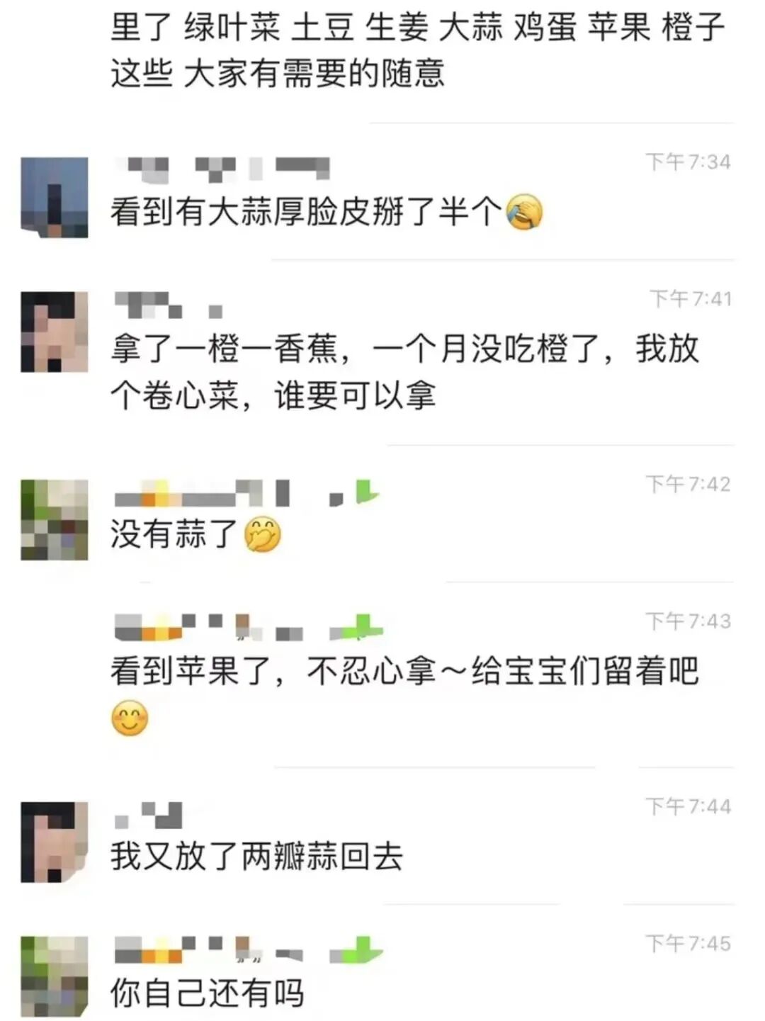小区全员阴性,响应号召尽量减少团购。我们可以,自己搞定自己。全都是按需拿,一把葱可以有3-4家拿到。蔬果、牛奶、零食、油盐酱醋、咖啡、烟,应有尽有。
