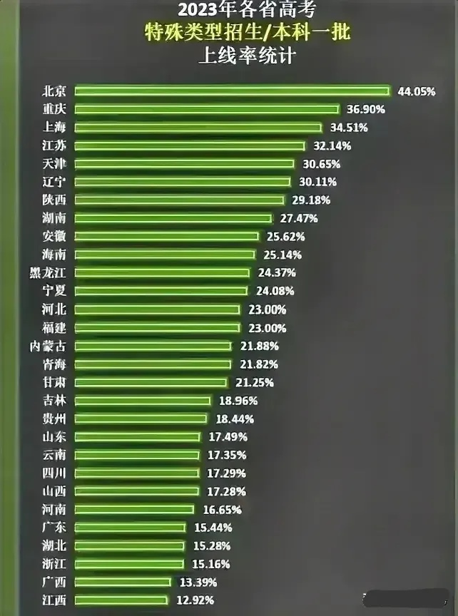 2023年的一本上线率,北京最高,达到了44.05%。等于100个考生里,有44个都可以上重点大学。难怪北京户口的价值,一直是全国第一的,想要入户北京,对于大多数年轻人来说,都是一个遥不可及的梦想。