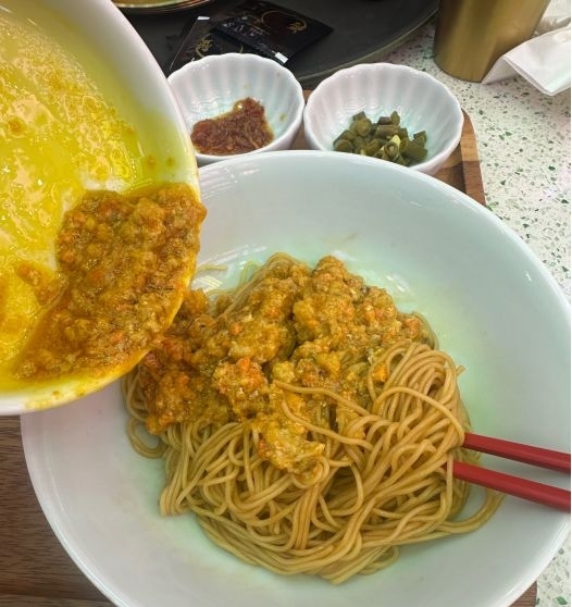 店内不仅提供蟹太太自家精心蒸制的大闸蟹,还有以蟹太太上等食材为原料烹制的多种佳肴。其中,“招牌黄金蟹黄面/饭”作为蟹黄面馆的镇店之宝,更是备受食客们的喜爱。这道菜选用优质上乘的大闸蟹,手工拆出蟹黄、蟹肉、蟹膏等主料,经过主厨秘方熬制出灵魂浇头,金灿灿的蟹黄落满面条,让人食欲大增。 此外,蟹太太蟹黄面馆还有秃黄油包、蟹黄小笼包、熟醉蟹等招牌菜品。秃黄油包外皮松软,内馅是拆取新鲜大闸蟹的蟹黄与蟹膏慢火熬制而成的秃黄油。蟹黄小笼包则选用精选优质大闸蟹的蟹黄为原料,包裹在薄如纸张的面皮中。熟醉蟹则选用新鲜优质且大小均匀的大闸蟹,搭配主厨秘制的醉料腌制而成,色泽红亮,口感鲜美,回味中带着丝丝甜意和酒香。 趁着天气正好,抽空去蟹太太蟹黄面馆合生汇新店打卡吧!